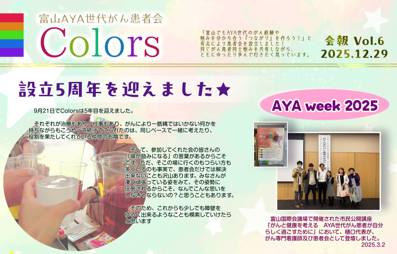 新年明けましておめでとうございます お知らせ 2026.01.01 - 0:00 新年明けましておめでとうございます。 旧年中は、活動にあたり多くの方々にお世話になりまして、誠にどうもありがとうございました。 美しい立山が見晴らせるこの富山の地で、頑張っているAYA世代がん患者さんの障壁を少しでもゆるくできるよう、本年も活動を続けてまいりたいと思いますので、よろしくお願いします。 ※写真は、レアもレア。冬の晴れの日、雲一つかかってない、北陸新幹線車両も写っている笑、代表渾身の一枚です⛰️☀️✨🚄💖